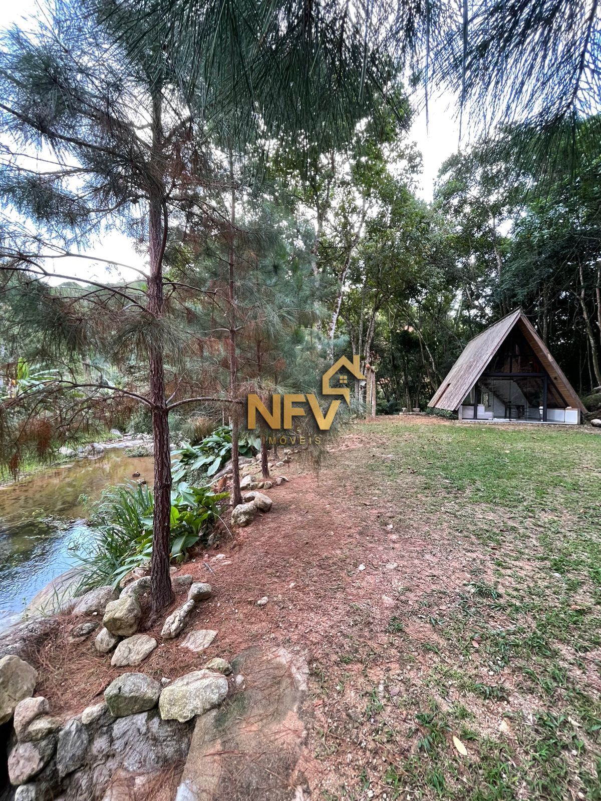 Em meio da natureza, lugar privado, atrás área verde e na frente contorna todo com um ribeirão de águas cristalina.